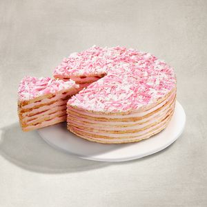 Chateau GateauxLayers of soft meringue and chopped almonds with raspberry infused cream and swirls of raspberry compote topped with pink and white chocolate flavoured shavings