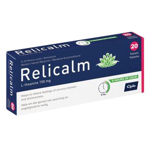 Dis-Chem5 hours of calm, no drowsiness Specifications Dosage and directions for use: Adult dose: Take 1 or 2 tablets with a glass of water when required to reduce feelings of anxiousness, in anticipation of stressful situations or 1 hour before bedtime. It takes approximately 30 minutes for RELICALM's effect t Ingredients Each RELICALM tablet contains 150 mg L-theanine. Inactive ingredients are colloidal anhydrous silica, croscannellose sodium, dibasic calcium phosphate (dihydrate), hydroxy propyl cellulose, magnesium stearate, microcrystalline cellulose and simethicone.