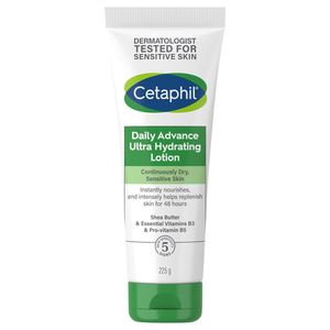 Dis-ChemThis Cetaphil Daily Advance Ultra Hydrating Lotion features a new and improved formula containing a science-backed blend of niacinamide (vitamin B3), panthenol (pro-vitamin B5), and hydrating glycerin. Enriched with 9 moisturisers, including shea butter, this lotion is clinically proven to continuously replenish and restore dry skin for 48 hours. It is designed to defend against 5 signs of skin sensitivity: weakened skin barrier, irritation, roughness, tightness, and dryness. It is dermatologist tested for sensitive skin and suitable for continuously dry, sensitive skin. Instructions: Use daily to hydrate and help protect dry, sensitive skin. Reapply as needed for enhanced nourishment. Specifications Dermatologist Tested For Sensitive Skin Suitable For Continuously Dry, Sensitive Skin Instantly Nourishes And Intensely Helps Replenish Skin For 48 Hours Contains Shea Butter & Essential Vitamins B3 & Pro-Vitamin B5 Paraben Free: Yes Fragrance Free: Yes Hypoallergenic: Yes Packaging Type: Tube Country Of Origin: Canada Features And Benefits: Dermatologist tested for sensitive skin, Continuously dry, sensitive skin, Instantly nourishes and intensely helps replenish skin for 48 hours, Shea butter & essential vitamins B3 & pro-vitamin B5 Skin Types: Dry, Sensitive Ingredients Aqua, Glycerin, Isopropyl Palmitate, Helianthus Annuus Seed Oil, Cetearyl Alcohol, Ceteareth-20, Dimethicone, Butyrospermum Parkii Butter, Panthenol, Niacinamide, Tocopheryl Acetate, Sodium PCA, Pantolactone, Glyceryl Stearate, Acrylates/C10-30 Alkyl Acrylate Crosspolymer, Sodium Benzoate, Potassium Sorbate, Citric Acid