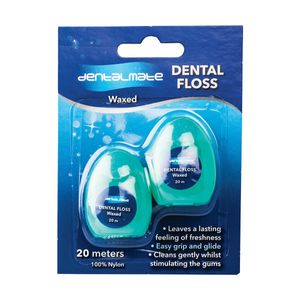 Dis-ChemDentalmate waxed mint dental floss comes in a pack pf 20 meters. The dental floss leaves a lasting feeling of freshness. The product has an easy grip and glide to use it more conveniently. The waxed mint dental floss cleans gently whilst stimulating the gums. It is 100% nylon and is available in 2 pieces. Specifications Keep it away from children's use.
