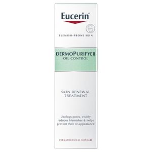 Dis-ChemThe Eucerin DermoPurifyer Skin Renewal Treatment is a dermatologically tested solution designed for blemish-prone skin. It actively works to unclog pores, reduce blemishes, and support skin renewal, helping to prevent their re-appearance for a clearer complexion. Instructions: Use once a day. Preferably in the evening. Apply a small amount (about the size of a pea) to a thoroughly cleansed face Massage gently into skin. Follow with an appropriate care product such as Eucerin DermoPurifyer Mattifying Fluid Specifications Product Type: Skin Renewal Treatment Unit Of Size: 40 Unit Of Measure: millilitre (ml) Pack Configuration: Each Product Width (mm): 29 Product Depth (mm): 30 Product Height (mm): 148.5 Product Gross Weight (g): 60 Packaging Type: Box Ingredients Aqua, Glycolic Acid, Dimethicone, Glycerin, Tapioca Starch, Cetearyl Alcohol, Glyceryl Stearate, Sodium Hydroxide, Gluconolactone, PEG-40 Stearate, Salicylic Acid, PEG-150 Distearate, Glycyrrhiza Inflata Root Extract, Panthenol, Xanthan Gum, Trisodium EDTA, Phenoxyethanol, Parfum