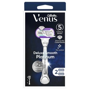 Dis-ChemThe Gillette Venus Raz Xtra Smooth Platinum razor is designed for a superior shaving experience. It is equipped with five deluxe blades that are diamond-like coated for durability and a longer-lasting performance. The razor features an ergonomic handle with an anti-slip soft grip, combined with a premium metal handle, offering excellent control. A Lubrastrip and a ribbon of moisture work together to surround the blades, providing exceptional glide across the skin. Specifications Brand: Gillette Product Type: Deluxe Smooth Razor Product Variant: Platinum Pack Configuration: Each Unit Of Size: 3 Unit Of Measure: Piece (pc) Features And Benefits: 5 deluxe blades for a longer lasting shave, Diamond-like coated blades, Lubrastrip for glide, Ribbon of moisture surrounds the blades for glide, Premium metal handle for control, Ergonomic handle, Anti-slip soft grip Packaging Type: Box What's In The Box: Razor, 2 Cartridges