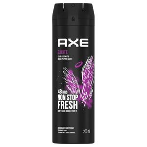 Dis-ChemAxe Excite aerosol deodorant body spray is designed to keep you smelling great and feeling fresh throughout the day. It boasts a woody fragrance with a touch of sweetness, blended with notes of crisp coconut, black pepper, hazelnut, and caramel. Featuring breakthrough fragrance technology, this deodorant body spray actively fights bad odours rather than just masking them, providing protection for up to 48 hours. It's a great addition to your personal hygiene routine to express your personality and mood. Instructions: Hold can upright and spray 15cm from underarm and body for best effect. Specifications Product Type: Aerosol Deodorant Body Spray Product Variant: Excite Volume: 200 millilitre Packaging Type: Aerosol Packaging Material: ALU Product Width (mm): 53 Product Depth (mm): 53 Product Height (mm): 164 Product Gross Weight (g): 180 Brand: AXE Country Of Origin: South Africa Features And Benefits: Breakthrough fragrance technology in this deodorant allows you to stay fresh and smell irresistible all day, Axe Excite deodorant has a subtle woody fragrance, with a hint of sweetness, merged with a blend of coconut, hazelnut, black pepper, and caramel notes, Axe aerosol deodorant body spray cleans up odour and leaves you smelling great, Axe's patented aerosol deodorant formula actively fights germs that cause odour, 48 hour aerosol spray deodorant protection against odour, Feel confident all day with Axe deodorant body spray Ingredients Alcohol Denat., Butane, Isobutane, Propane, Parfum, Alpha-Isomethyl Ionone, Butylphenyl Methylpropional, Citral, Citronellol, Coumarin, Geraniol, Hydroxycitronellal, Limonene, Linalool