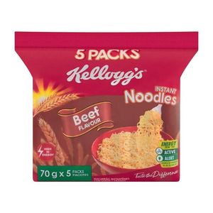 Presenting the delicious range of Kellogg’s Instant Noodles with the goodness of grains, great taste and high in energy. It is fortified with essential B vitamins which keeps you 'Active' and 'Alert' throughout the day. A convenient and easy meal to prepare, it can be consumed at any time of the day. Kellogg’s Instant Noodles can help you feel energized and leave a sensational taste on the pallet. It is available in Chicken, Beef, Cheese, Durban Curry & Vegetable Curry. Taste the Difference with Kellogg's Instant Noodles! | Kellogg's Instant Noodles 70G X5 Beef 70 G