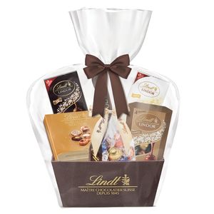 Lindt1 x Swiss Luxury Pralines 143g 1 x LINDOR Hazelnut Single 100g 1 x LINDOR White Single 100g 1 x LINDOR Assorted Cornet 200g 300g LINDOR Pick & Mix 1 x Medium Hamper Box