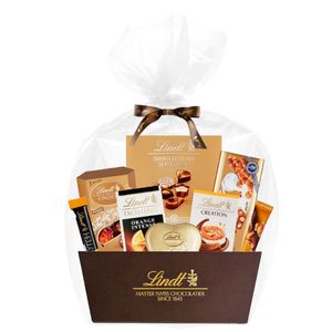 Lindt1 x LINDOR Assorted Cornet 75g 1 x Excellence Orange Intense 100g 1 x LINDOR Heart Tin 50g 1 x Swiss Luxury 143g 1 x Creation Crème Brulee 150g 1 x Hazelnut Gold Bar 300g 2 x LINDOR Caramel Stick 38g 1 x Large Hamper Box