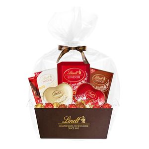 Lindt1 x LINDOR Milk Cornet 200g 1 x LINDOR White Single 100g 1 x LINDOR Hazelnut Single 100g 1 x LINDOR Milk Heart Tin 50g 1 x LINDOR Assorted Heart Tin 50g 1 x LINDOR Milk Stick 38g 1 x Large Hamper Box Pick & Mix 700g