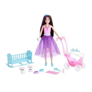 Toy KingdomGentle and cuddly it's hard to find a sweeter pet than a little baby sheep! This adorable Barbie playset features Skipper doll two lambs and accessories that inspire nurturing play -- including a carriage-inspired stroller rocking crib and more. Skipper wears a sweet look with a pink bodice purple tulle skirt and blue bow. Skipper doll cannot stand alone. Colors and decorations may vary. Help Skipper doll care for two precious little lambs as they embark on a day filled with play mealtimes naps and more with this Barbie playset! Skipper is ready for pet sitting in a pastel fantasy look that includes a pink bodice and purple skirt with a sheer tulle overlay. She has brunette hair with a purple streak for a pop of brightness! The bright blue hair bow belt and shoe accessories add colorful touches to her ensemble. Kids can explore nurturing role-play with two bottles and two feeding bowls as well as a blanket and comb for the animals to share. Put the lambs in the carriage-inspired stroller to take them for a walk and when it's time for bed place them gently in the rocking crib and sing a lullaby! Spark imaginative play with this dreamy Skipper fantasy set! It makes a perfect gift for kids ages 3 and up along with other Barbie dolls and playsets!