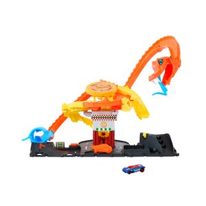 Toy KingdomTake on a hungry cobra that has slithered into the pizza shop and save Hot Wheels City just like in the Netflix series 'Let's Race'! Drive into the cobra's tail and release it to see which of three random paths the car will take. Will it race through the cobra's mouth and end up in the dumpster? Maybe it will have the unfortunate ride that ends in the creature's mouth. Or maybe it will send a pizza pie smack into the cobra's face defeating it! The set features cool track play details to inspire storytelling adventures and can connect to other Hot Wheels City sets for open-ended play. Each sold separately. One Hot Wheels car is included. Colors and decorations may vary. Save the Hot Wheels City pizza shop from a massive cobra that has taken it over! When kids release the included cobra's tail it sends their cars onto one of 3 paths randomly chosen and packed with suspense and adventure. The set is featured in the Netflix series 'Let's Race'. Kids can reenact their favorite scenes or create new ones rooted in their own imaginations! The tail track leads to either the cobra's mouth a dumpster or knocks the cobra out with a pizza pie to its face! Connect this to other Hot Wheels and Matchbox sets for open-ended play and unlimited adventure. What's in the box Includes 1 Hot Wheels toy car in 1:64 scale makes a great gift for any occasion! Includes 1 Hot Wheels City Pizza Slam Cobra Attack playset and 1 Hot Wheels car in 1:64 scale.