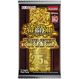 Toy KingdomMark the incredible 25th anniversary of the Yu-Gi-Oh! Trading Card Game with the Quarter Century Bonanza Booster Pack. This special edition pack celebrates a quarter century of dueling history bringing together iconic cards powerful reprints and the possibility of pulling ultra-rare anniversary cards. Each booster pack contains 5 random Yu-Gi-Oh! trading cards giving players and collectors the thrill of discovering new strategies powerful monsters spells and traps to enhance their decks. The set includes a variety of collectible rarities including special Quarter Century Secret Rare cards created specifically to commemorate the 25th anniversary. Perfect for both experienced duelists and collectors these booster packs are a great way to expand your deck hunt for rare cards or relive classic Yu-Gi-Oh! moments. Whether you’re building a competitive deck or growing your collection the Quarter Century Bonanza Booster Pack delivers excitement with every pack opened.