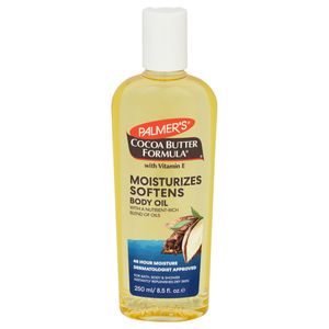Dis-ChemPalmer's Moisturizing Body Oil is a light oil specifically formulated with pure Cocoa Butter, Vitamin E, Soybean Oil, Sesame Seed Oil and Safflower Seed Oil that moisturises, softens and soothes rough dry skin. It helps improve the appearance of scars, stretch marks and imperfections on the skin. Rich, non-greasy formula absorbs quickly into skin.Paraben-free and Phthalate-free. Apply after bath or shower or pour directly in the bath.