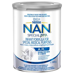 Dis-ChemNESTL NAN SPECIALpro A.R. 800g BABY FORMULA for Young children for special medical purposes can be used in this way, Wash your hands carefully. Wash bottle, teat and cap or cup and spoon. Boil for 5 minutes, leave covered until use. Boil drinking water for 5 minutes and allow to cool. Strictly follow the feeding table. First, pour water into the bottle or cup to the required level. Then, add powder using only the scoop provided, carefully leveling off the extra powder. Cap and shake bottle or stir cup with sterilized spoon until powder is fully dissolved. Check temperature before feeding. Make sure the scoop is dry and store back into the tin. To maintain the number of living cultures, the boiled water must be cooled down to body temperature before adding the powder. Close tin tightly after each use. Store in a dry place below 25 C. Use within 3 weeks of opening. Specifications This product can be used in this way, Wash your hands carefully. Wash bottle, teat and cap or cup and spoon. Boil for 5 minutes. Leave covered until use. Boil drinking water for 5 minutes and allow to cool. Strictly follow the feeding table. First, pour water into the bottle or cup to the required level. Then, add powder using only the scoop provided, carefully leveling off the extra powder. Cap and shake bottle or stir cup with sterilized spoon until powder is fully dissolved. Check temperature before feeding. Make sure the scoop is dry and store back into the tin. To maintain the number of living cultures, the boiled water must be cooled down to body temperature before adding the powder. Close tin tightly after each use. Store in a dry place below 25 C. Use within 3 weeks of opening. Ingerdients Skimmed Milk Powder (Cow's Milk), Lactose Powder, Demineralized Whey Powder (Cow's Milk), Starch (Potato, Maize), Vegetable Oil [Palm Fruit, Rapeseed, Coconut, Sunflower Seed, (Ascorbyl Palmitate)], Calcium Citrate, Potassium Citrate, Soya Lecithin, Magnesium Chloride, Amino Acids (L-Phenylalanine, Taurine, L-Histidine, Carnitine), Sodium Chloride, Calcium Phosphate, Vitamins (A, B1, B2, B6, B12, C, D3, E, Biotin, Folic Acid, Inositol, K1, Niacin, Pantothenic Acid), Ferrous Sulphate, Zinc Sulphate, Sodium Citrate, Lactic Acid Producing Culture [Limosilactobacillus reuteri (DSM 17938#)], Copper Sulphate, Manganese Sulphate, Potassium Iodide, Sodium Selenate.