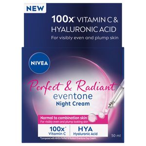 Dis-ChemExperience the NEW NIVEA Perfect & Radiant eventone Night Cream, specifically developed for normal to combination skin. This advanced formula is enriched with 100 Vitamin C and Hyaluronic Acid to work overnight, targeting visibly even and plump looking skin. It helps restore your skins natural radiance while you sleep. Compared with NIVEA Perfect & Radiant Eventone Day Cream. Specifications Product brand: nivea Product volume: 50ml Key ingredients: 100 vitamin c, hyaluronic acid Skin type suitability: normal to combination skin