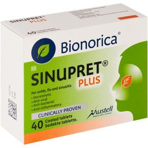 Dis-ChemFor colds, flu and sinusitis. Secretolytic. Anti-viral. Anti-bacterial. Anti-inflammatory. Clinically proven 4-day faster recovery. Specifications Adults and adolescents from the age of 12 years: take 1 coated tablet 3 times daily. Ingredients Each coated tablet contains 160 mg genuine dry extract (3- 6:1) derived from gentian root, primula flower, sorrel herb, elder flower, verbena herb (1:3:3:3:3). 1st extraction agent: ethanol 51% (m/m). Each Sinupret® Plus coated tablet contains on average 0,3 g available carbohydrates. Sinupret® Plus coated tablets are gluten and lactose free.